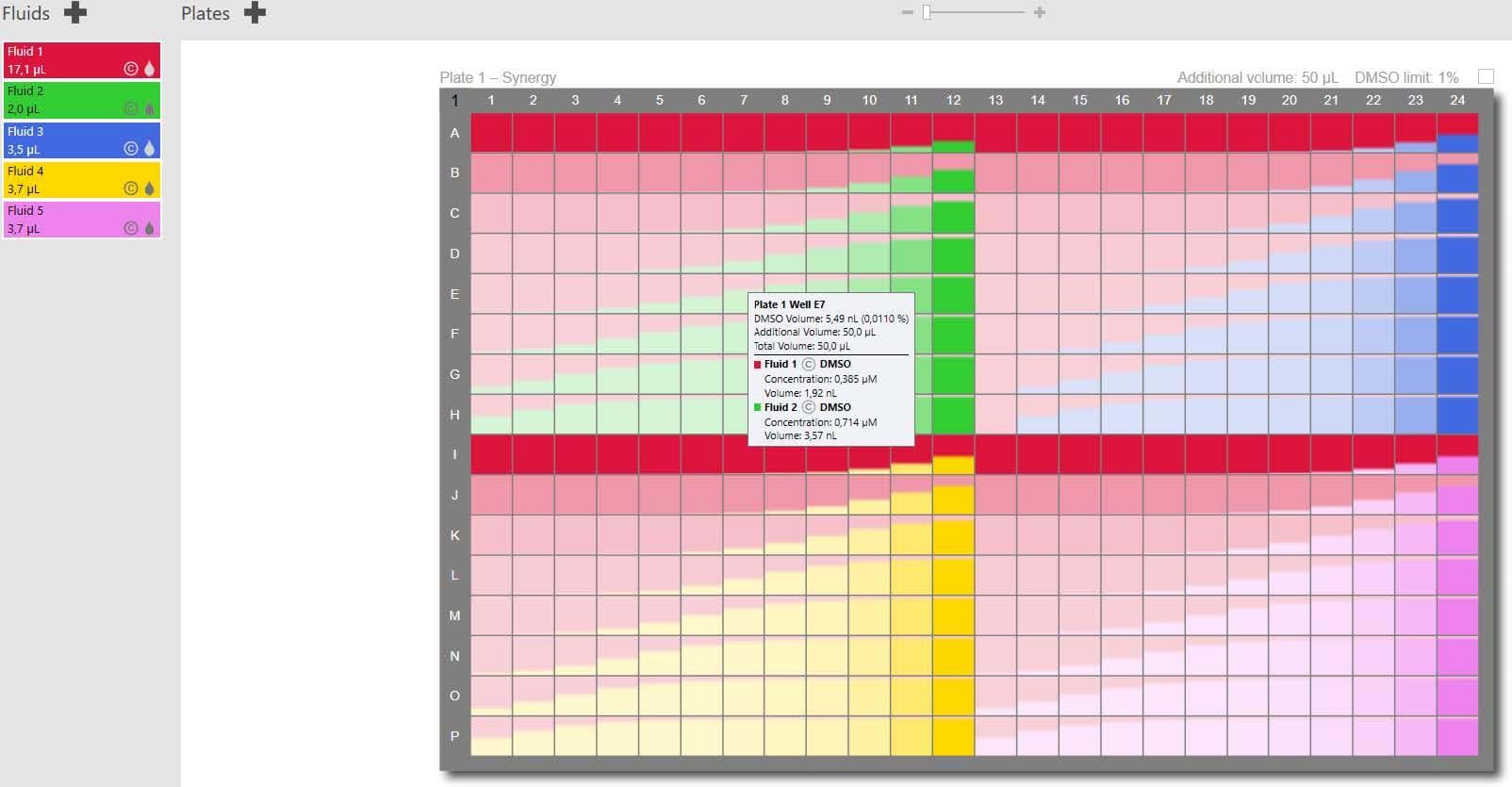 Det er et enkelt oppsett for titrering av medikamenter for IC50 og EC50 bestemmelser. Synergitester utføres med flere forskjellige væsker.