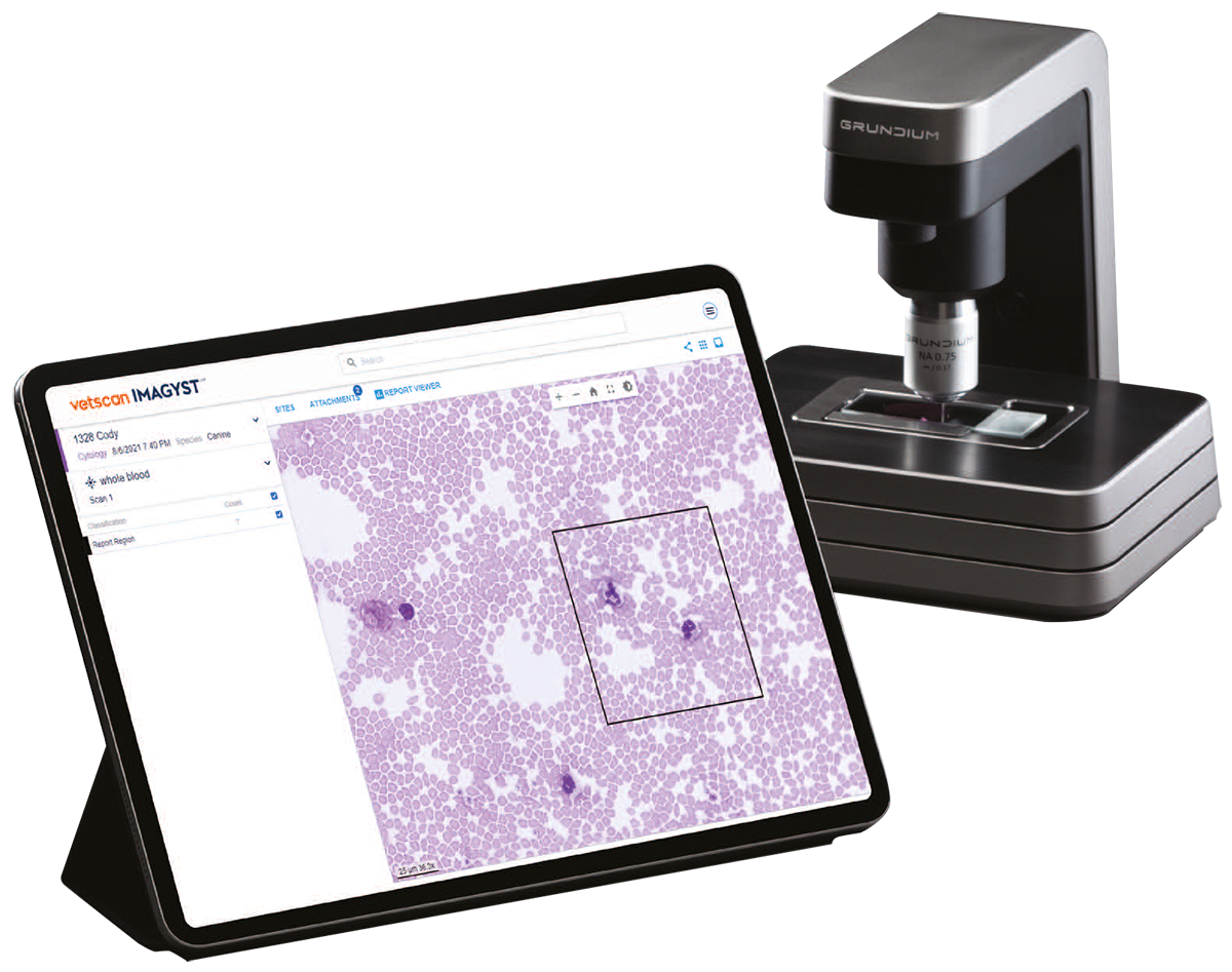 Vetscan Imagyst skanner cytologiprøver og sender bildene sømløst til et nettverk av on-line patologer for vurdering. Svar på spesialistnivå etter ca. 2 timer. - AI Masses