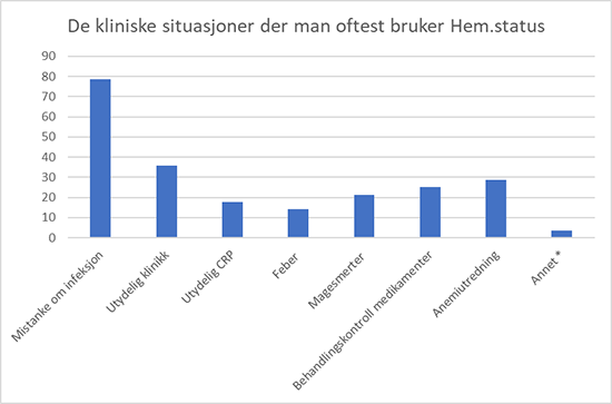 Undersøkelsen omfattet flere spørsmål, blant annet hvilke kliniske situasjoner leger benytter celletelleren mest i og resultatene så slik ut (inntil 2 svar var mulig):