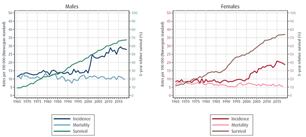 Figuren nedenfor er tatt fra årsrapporten "Cancer in Norway 2019" og viser en økning i 5-års relativ overlevelse både for menn og kvinner. Siden 1970-tallet har det vært flere overlevende enn dødsfall av sykdommen.